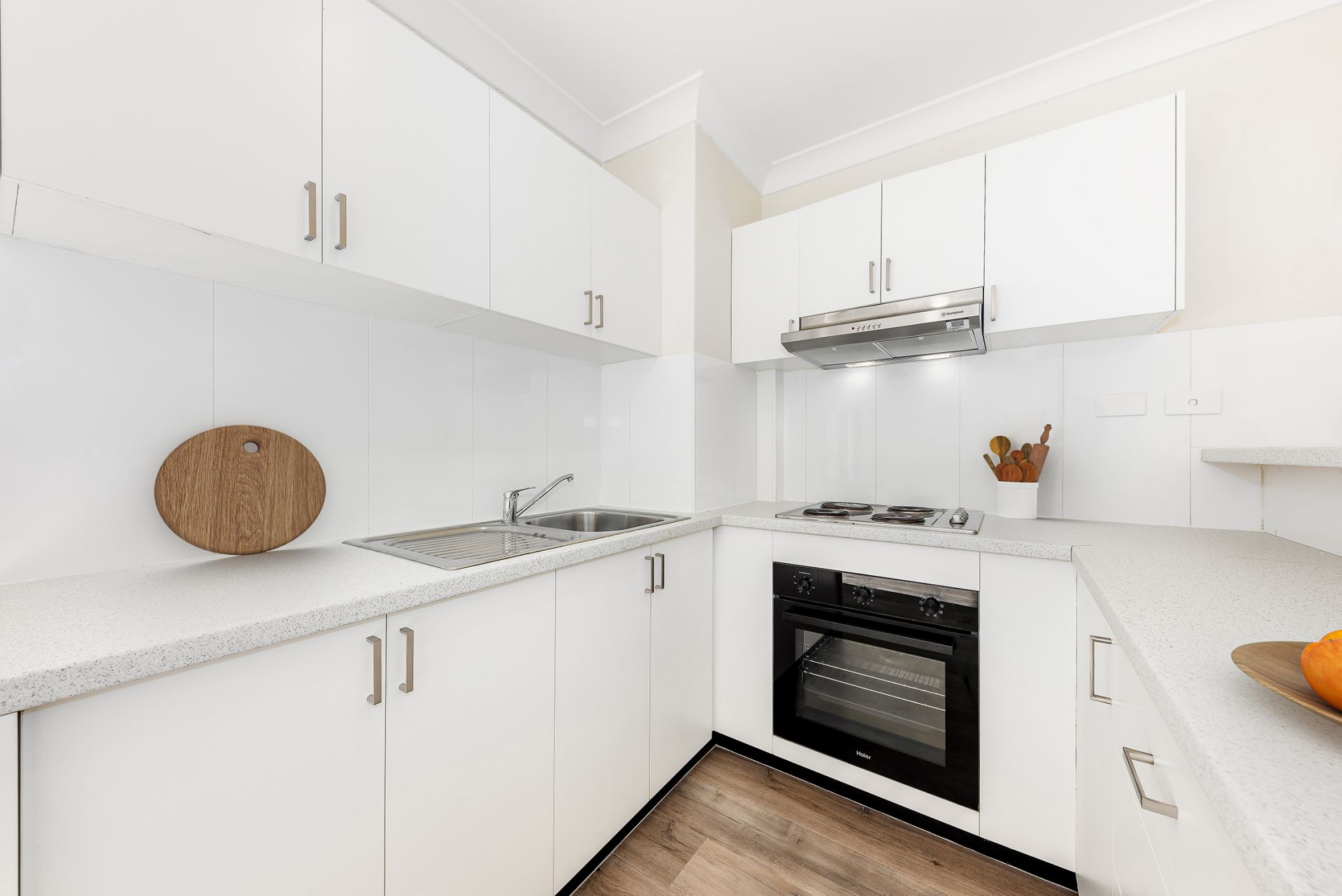 Brand new open-plan kitchen with stainless steel cooktop and oven